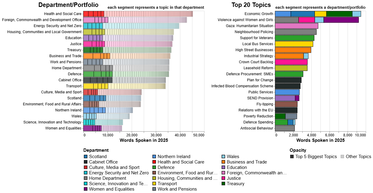 The chart shows which topics were discussed, who spoke about them and how much was said by each person and to which party they belong.